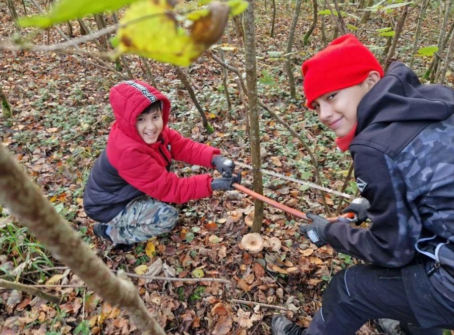 An vier Terminen, die über das Schuljahr verteilt waren, begaben sich die Schülerinnen und Schüler in den nahegelegenen Wald. So konnten sie das Ökosystem Wald im Frühling, Sommer, Herbst und Winter erleben und beobachten, wie sich die Natur im Laufe des Jahres verändert. Ganz praktisch wurde geschnitzt, gehobelt, geschraubt und gebaut – echtes Handwerk mit Holz!