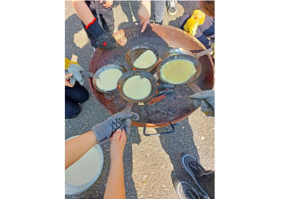 Eine willkommene Pause war das gemeinsame Zubereiten der Mahlzeiten auf dem Lagerfeuer. Ehemalige Streithähne rührten einträchtig die Tomatensoße für die Pizza Calzone, Äpfel wurden für die Pfannkuchen mit Apfelmus geschnitten und gekocht und obwohl so mancher Pfannkuchen eher dunkelbraun war, aßen alle genüsslich und mit gutem Appetit.