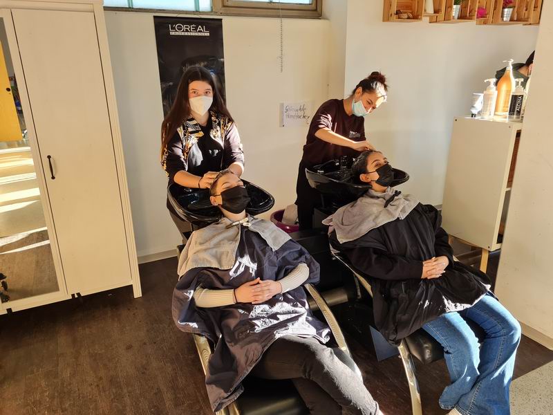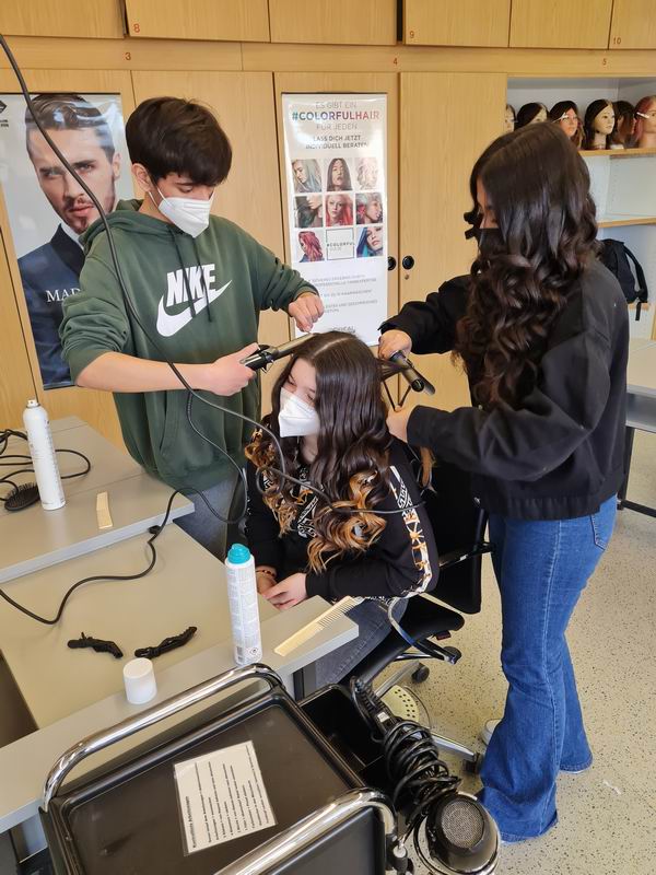 An einem weiteren Tag durften wir den Beruf Friseur*in kennenlernen. Wir haben uns gegenseitig die Haare gewaschen und gestylt. Anschließend haben wir die Hände massiert. Freitags war meine Gruppe nochmal dort. Wir haben an diesem Tag an einem Puppenkopf gearbeitet und auf diesen Farbe aufgetragen. (Emely Klasse 8a)