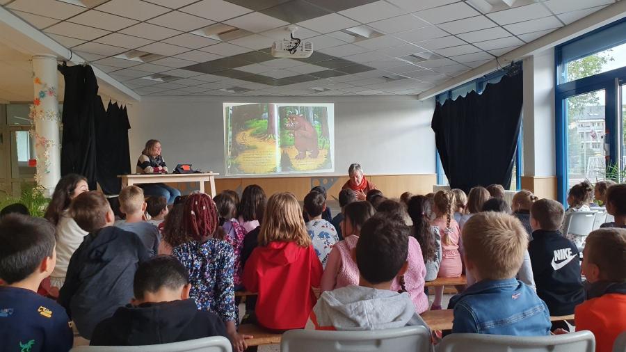 In der Aula wurde altersgerechte Kinderliteratur vorgelesen. Jeweils eine Klassenstufe durfte dabei eine Schulstunde zuhören, um danach/davor noch in den Klassenzimmern mehr zum Thema zu erfahren.