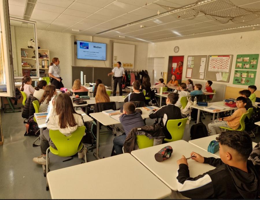 Eine Polizeioberkommissarin und Polizeihauptmeisterin von der Kriminalpolizei Offenburg besuchten heute die 5. Klasse der Astrid Lindgren Schule, um die Schülerinnen und Schüler im Bereich Medienprävention aufzuklären.